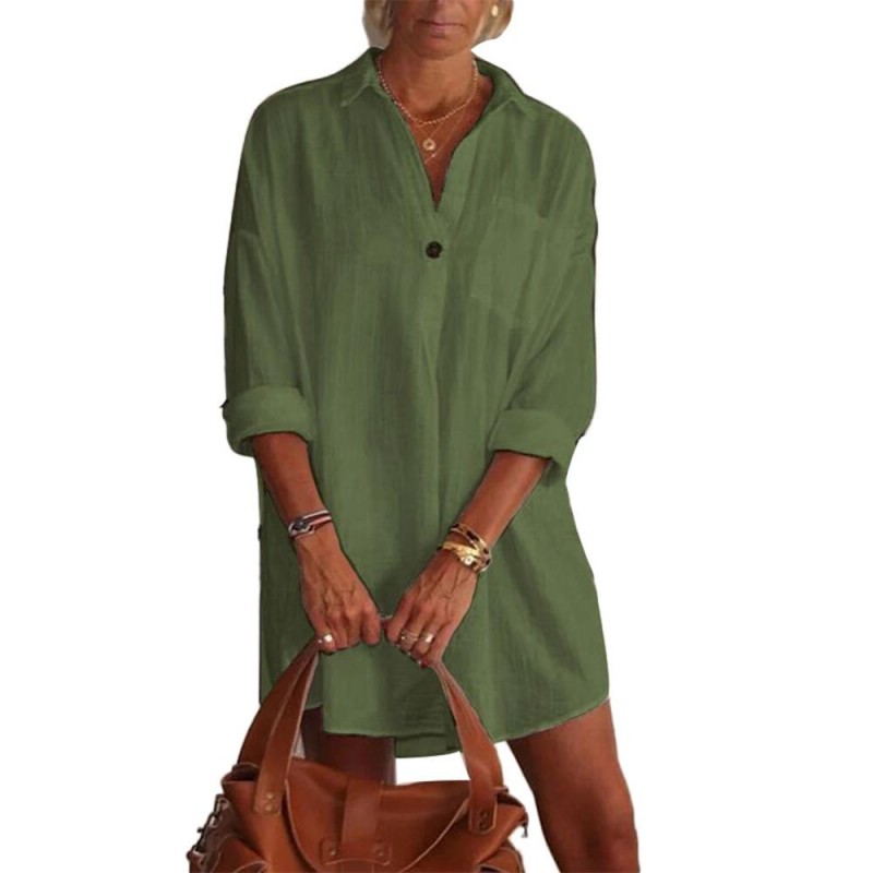 Elegant Women Solid Color V Neck Long Sleeve Pocket Button Loose Long Shirt Mini Dress